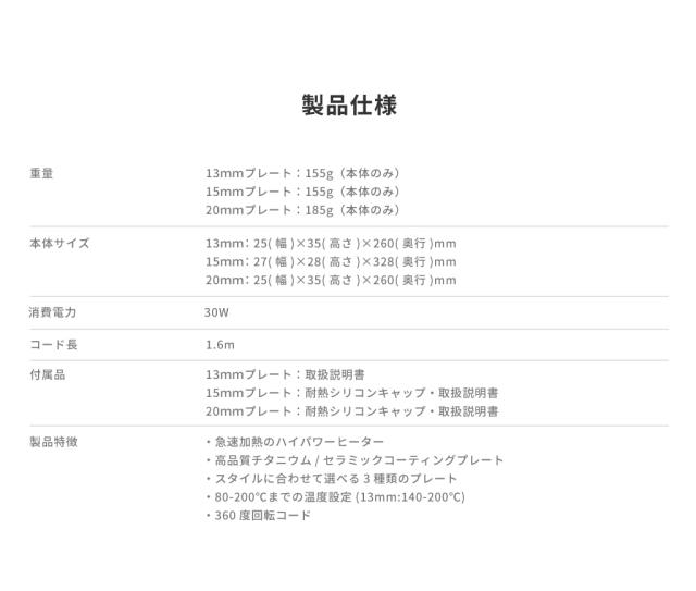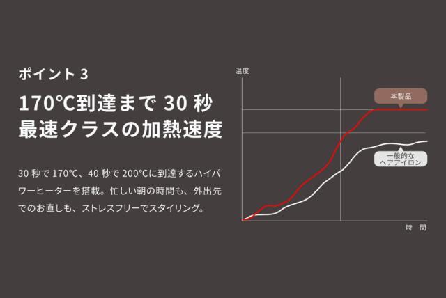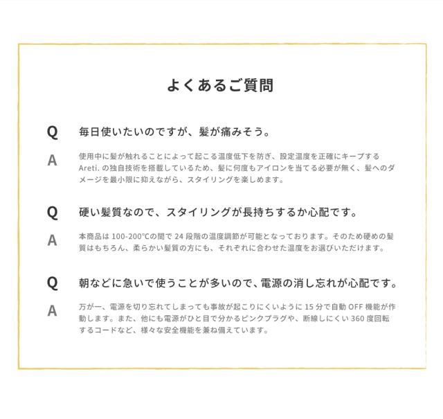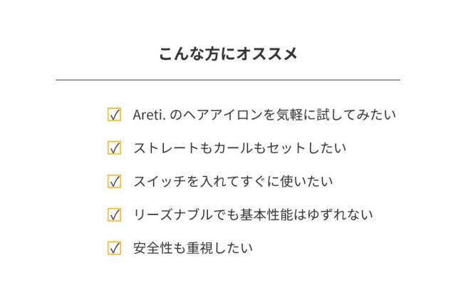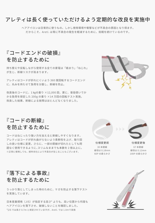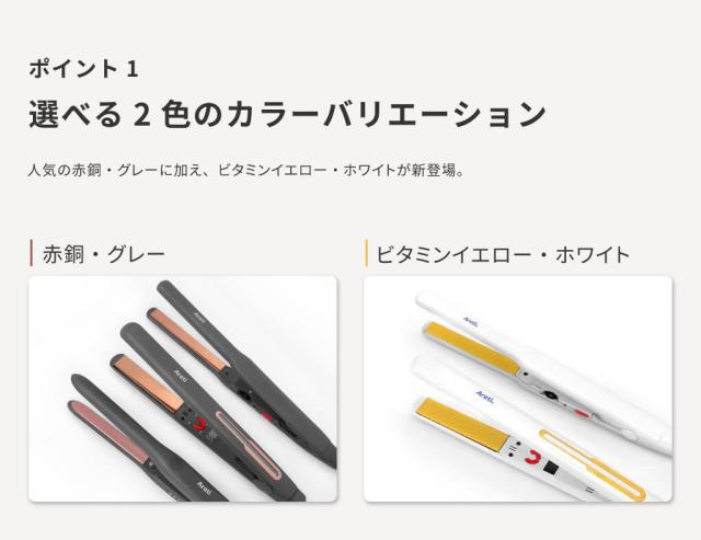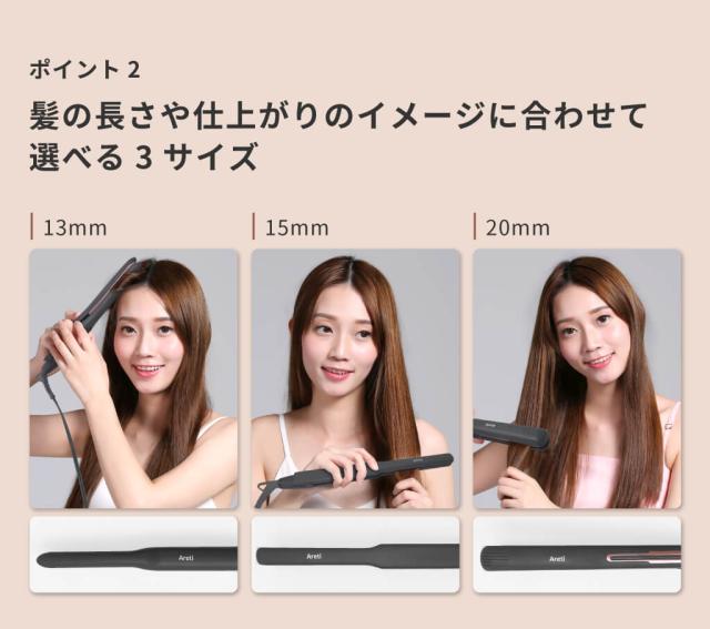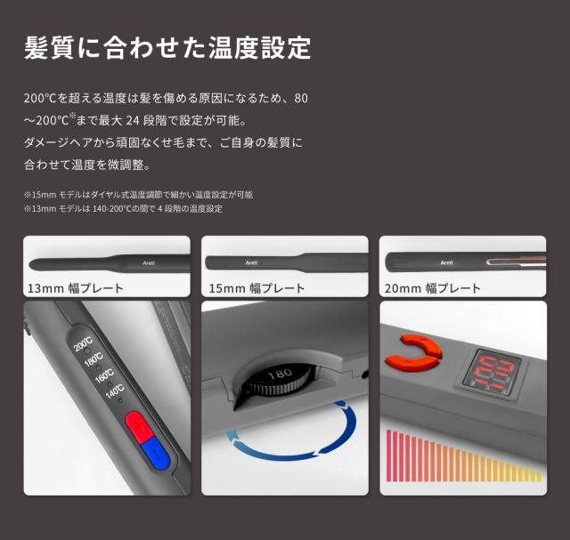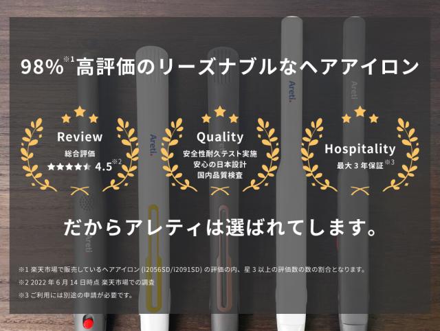 | 【 アレティの定番ヘアアイロンのリニューアル 】2021年7月30日にアレティの定番ヘアアイロンをリニューアル。お求めやすい価格となりました。 2021年9月16日にファイン(15mm)の予約販売を開始しました。 2022年7月15日に新カラー(ビタミンイエロー)の発売です。 【 アレティの定番アイロンならパーフェクトを簡単に 】引っかかりにくい仕様で、髪へのダメージを軽減し、スタイリングの跡が残りません。ストレートアイロンとしても カールアイロンとしても ご使用いただける 2way モデルとして、ランキング常連のアイロンです。男性のヘアスタイリングにも オススメです。 【 業界最速レベルの立ち上がり時間 】電源を入れてから170℃に到達するまでわずか約60秒。高性能ヒーターを搭載し、急速加熱を実現しました。忙しい朝や急ぎの際にスピーディーなヘアセットが可能です。また画面に設定温度が表示され、5℃間隔で温度調整が可能なので自分の髪質に合わせた最適なスタイリングを実現します。 【 2022年度最新版 】コード根本の構造・コードの形状・検品の強化を行いました。ケーブルを一日15回以上折り曲げても2年間持つよう品質管理を実施しています。※コードに1kgの重りを付け、1分間に6回の回転を12000回以上実施。もしトラブルが起きてしまった場合も製品を安心してお使いいただくために、メーカー1年保証・最大3年保証をお付けしております。万が一、故障の際は新品交換をいたします。Areti 専属の日本人オペレーターがございますのでお気軽にお問い合わせください。 ●メーカー1年保証。カスタマーサポートへのお問い合わせは2営業日以内にメールや電話で素早くお返事いたします。安全性を最優先にするため、万が一の故障の際には修理ではなく未使用品と交換致します。 |