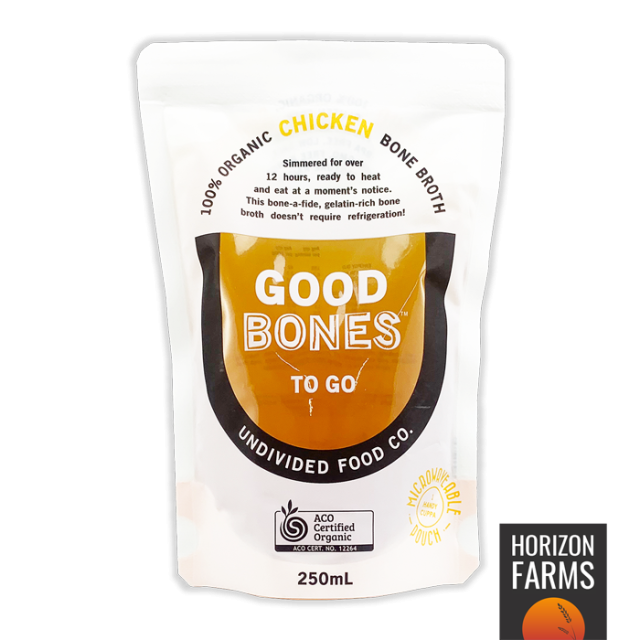 こちらのゼラチンを豊富に含んだ本格的なボーンブロススープは、ご家庭で鶏ガラから直接ボーンブロスをお作りいただくよりもお手軽にお楽しみいただけます。100%オーガニックで、加熱してすぐにお召し上がりいただけるチキンボーンブロスをパウチに詰めました。