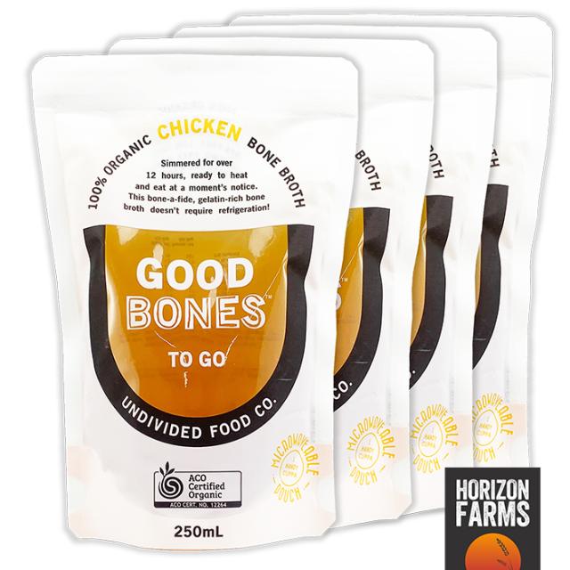 こちらのゼラチンを豊富に含んだ本格的なボーンブロススープは、ご家庭で鶏ガラから直接ボーンブロスをお作りいただくよりもお手軽にお楽しみいただけます。100%オーガニックで、加熱してすぐにお召し上がりいただけるチキンボーンブロスをパウチに詰めました。