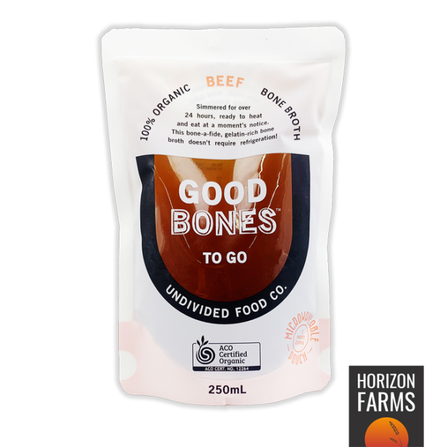こちらのゼラチンを豊富に含んだ本格的なボーンブロススープは、ご家庭で牛骨から直接ボーンブロスをお作りいただくよりもお手軽にお楽しみいただけます。100%オーガニックで、加熱してすぐにお召し上がりいただけるビーフボーンブロスをパウチに詰めました。