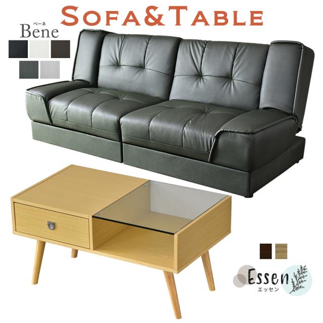 ソファ 2人掛け ソファベッド 収納 引き出し収納 リクライニング ローソファ テーブル ガラステーブル センターテーブル ローテーブル 北欧 ベーネ エッセン