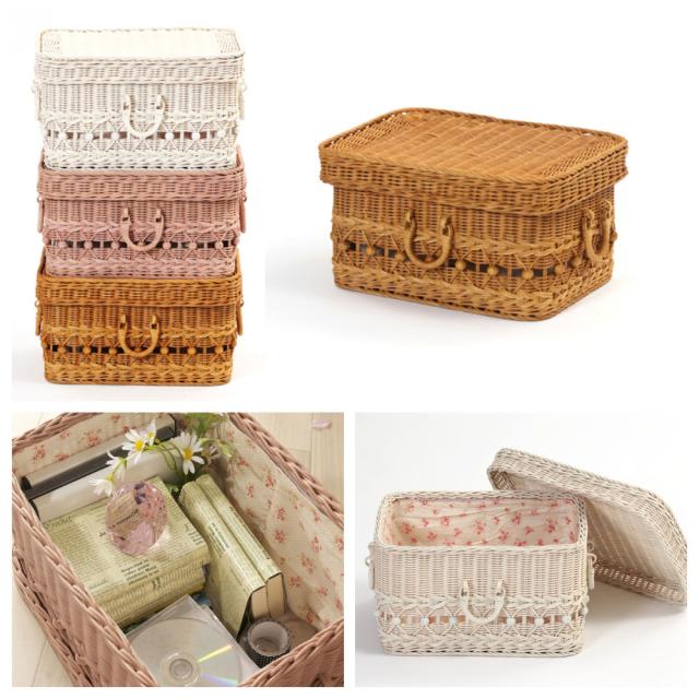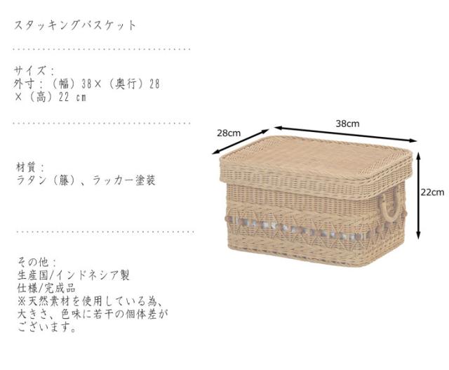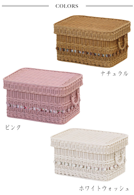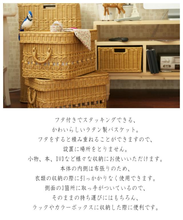 | 説明 | フタ付きでスタッキングできる、かわいらしいラタン製バスケット。 フタをすると積み重ねることができますので、設置に場所をとりません。 小物、本、DVDなど様々な収納にお使いいただけます。 本体の内側は布張りのため、衣類の収納の際に引っかかりなく使用できます。 側面の3箇所に取っ手がついているので、そのままの持ち運びにはもちろん、ラックやカラーボックスに収納した際に便利です。 ロマンティックなお部屋はもちろん、ガーリー系、カントリーやナチュラルなど、様々なシーンに合わせやすいデザイン。 全面に天然素材の籐(ラタン)を手作りで編みこんだ贅沢なつくり。 リボンをモチーフにしたかわいい編みデザイン。 |