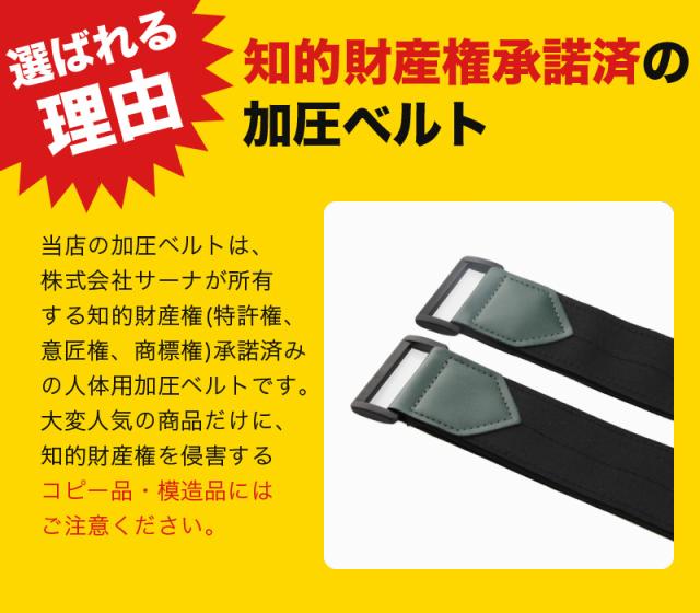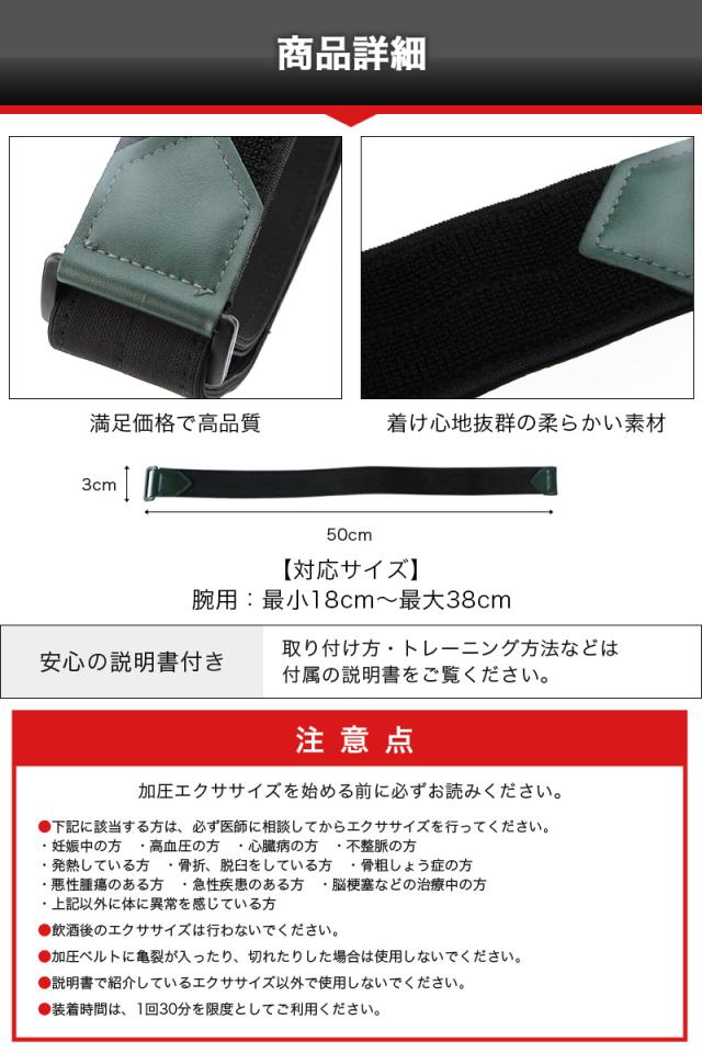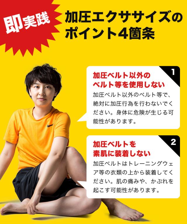 | 注意事項 | ※下記に該当する方は、必ず医師に相談してからエクササイズを行ってください。 ・妊娠中の方・高血圧の方・心臓病の方・不整脈の方・発熱している方・骨粗しょう症の方 ・悪性腫瘍のある方・急性疾患のある方・脳梗塞などの治療の方・骨折、脱臼をしている方 ・上記以外に体に異常を感じている方 ※万が一当商品のご使用で人影響が発生されても、自己責任として免責とさせていただきます。 ※商品は天然ゴムですので袋から開封後は、天然ゴムのにおいがします。ご了承下さいませ。ご理解ご了承の上お買い求めください。 ※飲酒後のエクササイズは行わないでください。 ※加圧ベルトに亀裂が入ったり、切れたりした場合は使用しないでください。 ※説明書で紹介しているエクササイズ以外で使用しないでください。 ※装着時間は、1回30分を限度としてご利用ください。 |