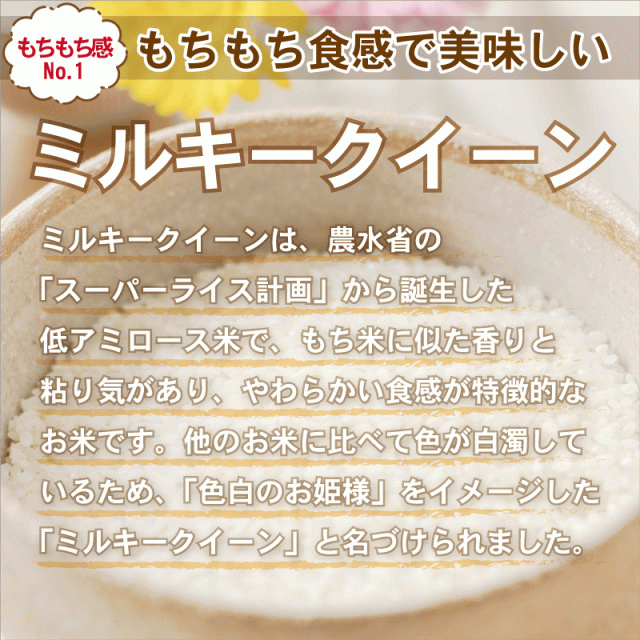 もち米に似た香りと粘り気がありやわらかい食感が特徴的なお米です。ほかのお米に比べて白く白濁しているため、「白色のお姫様」をイメージし「ミルキークイーン」と名付けられました。