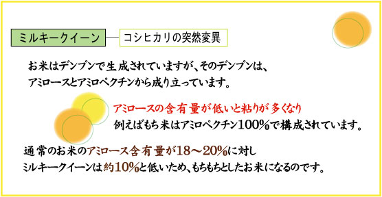 ■ミルキークイーンは、通常のうるち米に比べてもち米に似た香りと粘りがある『もちもちっ』とした食感が特徴の低アミロース米です。