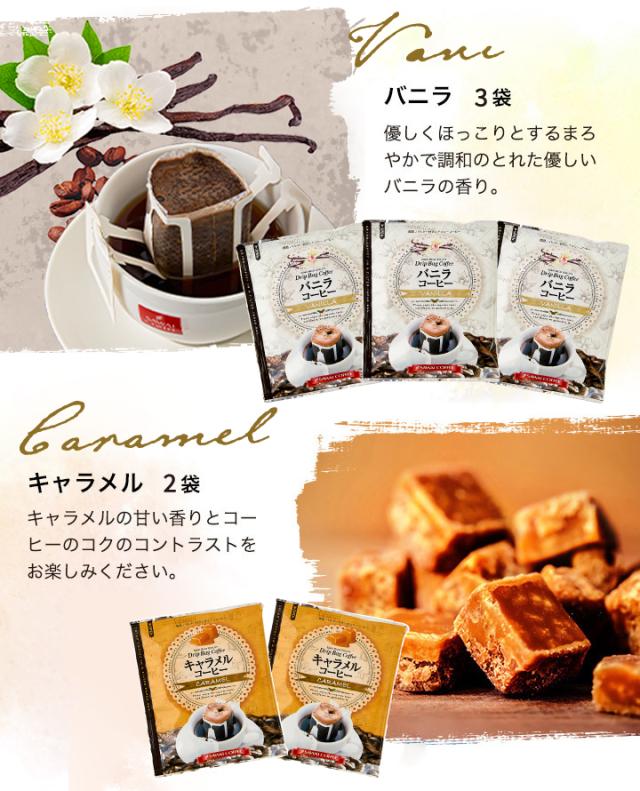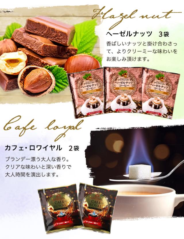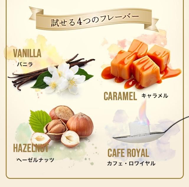 | 内容量 | ・バニラコーヒー 8g×3袋 ・キャラメルコーヒー 8g×2袋 ・ヘーゼルナッツコーヒー 8g×3袋 ・カフェ・ロワイヤル 8g×2袋 |