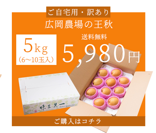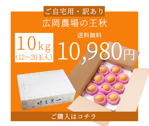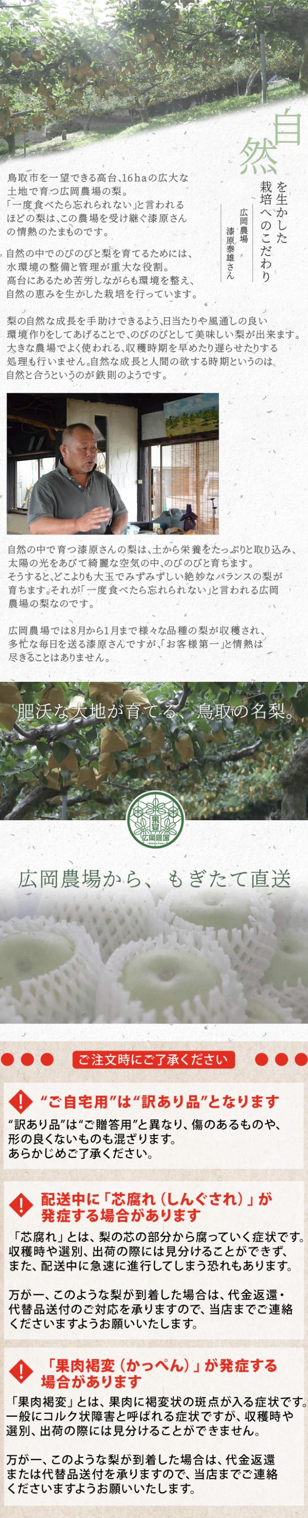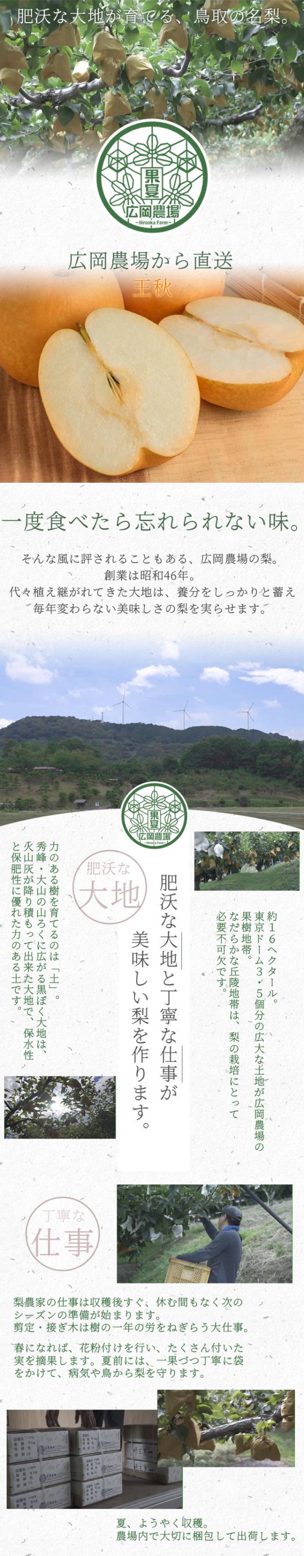 肥沃な大地と絶好のロケーションに恵まれた名梨の果樹園「広岡農場」から、もぎたて新鮮な梨をお届け。広岡農場では、鳥取が誇る青梨の代表品種「二十世紀梨」をはじめ近年人気の「新甘泉」「秋栄」「あきづき」「王秋」を生産。当商品は緻密な果肉にたっぷり果汁の「晩生梨の新定番」、王秋梨のご自宅用となります。※出荷期間は11月上旬〜12月上旬を予定しています。