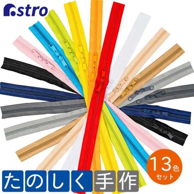 樹脂ファスナー 5号 50cm 13色(本)セット コイルファスナー 両開きダブルスライダー 止具なし 手芸用品 ハンドメイド アストロ 888-14