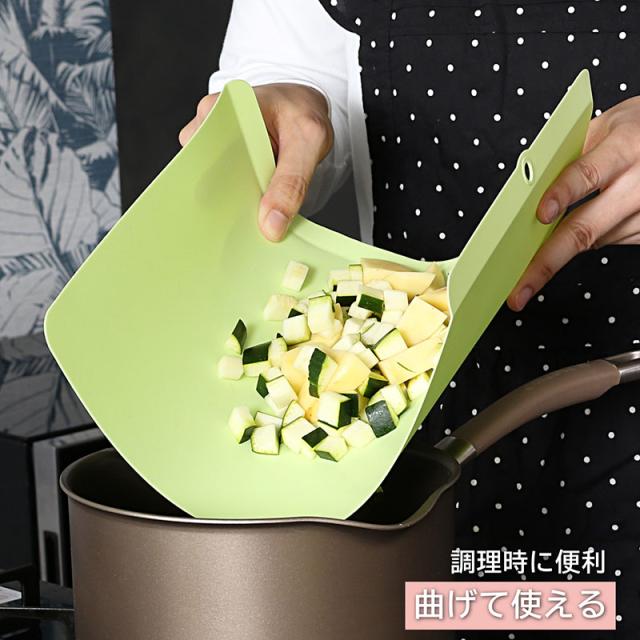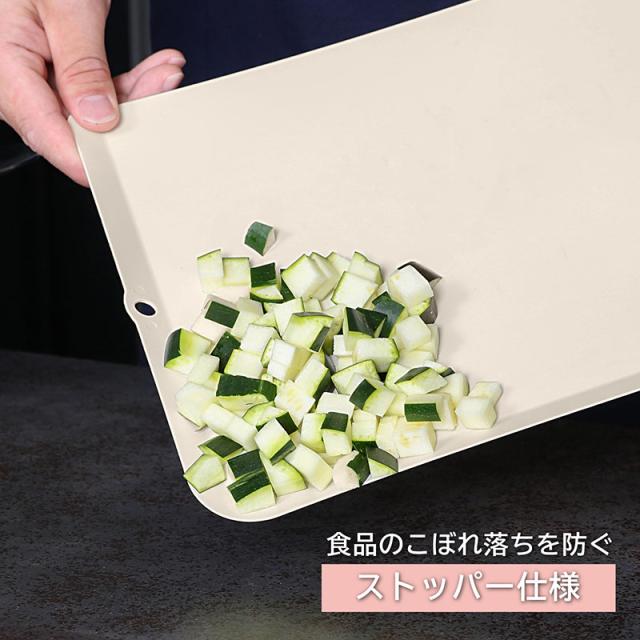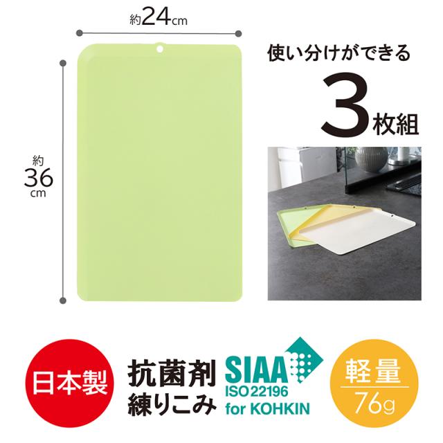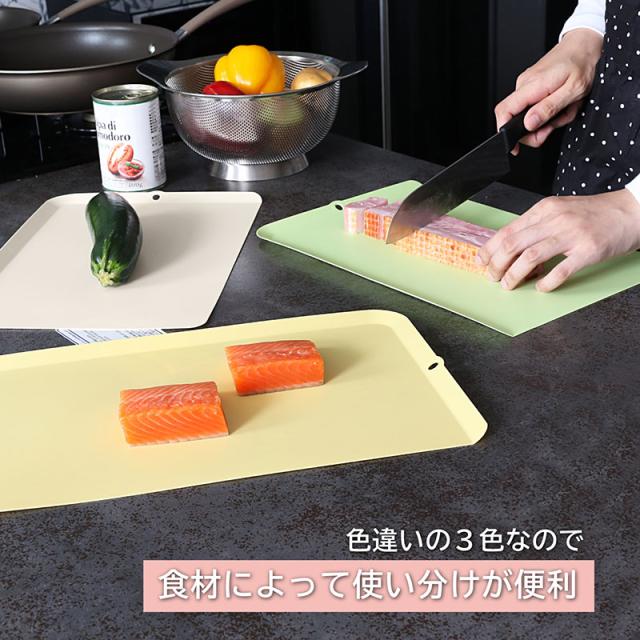 商品名:抗菌まな板(L) 3枚組 ナチュラル MM3カラー:アイボリー・イエロー・ライトグリーン各1枚サイズ:約36×24×0.1cm重量(1枚):約76g材質:ポリプロピレン(無機系抗菌剤ゼオミック練り込み)内容:3枚生産国:日本【耐熱温度】●120℃【特長】●抗菌加工により細菌の増殖を抑制する大きめサイズのまな板3枚セット。●これまでのまな板に比べて、軽くて使いやすく、洗いやすく、収納しやすい。●柔らかい素材なので切った食材を乗せたまま、まな板を丸めてお鍋に移せる。●さいの目切りした豆腐などもそのままお鍋に入れられて、お料理がスムーズ。●サイドには刻んだ食材のこぼれ落ちを防止するフードストッパー付きで便利。●少量のカット、色移りが心配な食材、臭いの強い食材のカットの際にも便利。【ご注意】●食器洗浄機・食器乾燥機は使用しないでください。●製品に同梱の使用上のご注意をよくお読みいただき、正しくご使用ください。