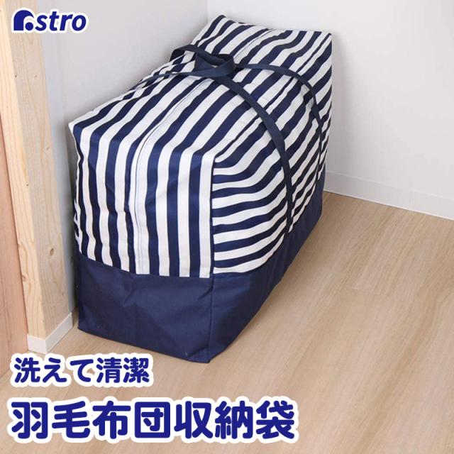 商品名:洗える羽毛布団収納バッグ ボーダー ネイビーカラー:ネイビー柄:ボーダーサイズ:約幅69x奥行30x高さ50cm材質:ポリエステル内容:1個生産国:中国【収納目安】●シングルサイズもしくは、ダブルサイズの羽毛布団:約1枚【特長】●丈夫なオックスフォード生地のバッグで、羽毛布団をホコリから守り保管。●ダブルサイズの羽毛布団も入るビッグサイズなので、布団類の収納に重宝。●長めの持ち手付きでクリーニングや引っ越しなどの際の持ち運びにも便利。●ダブルファスナーで3辺が開くので、羽毛布団や合い掛け布団の出し入れがスムーズ。【ご注意】●洗濯の際は洗濯ネットを使用し、干す際は日陰で平干ししてください。【ASTRO CO., LTD】1970年創業、不織布収納日用品メーカーとして「アストロ」のオリジナル商品を販売しています。生地の開発から製造、流通、品質管理を自社管理。収納用品をメインに多彩な日用品を企画販売してまいりました。アストロは暮らしを楽しく便利にさせる商品をこれからも創造し続けます。established in 1970