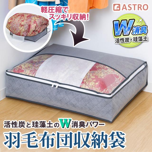 商品名:珪藻土入り消臭羽毛布団保存袋カラー:グレーサイズ:約幅65×奥行50×高さ15cm材質:ポリプロピレン、活性炭、珪藻土粒、ポリエチレン内容:1枚生産国:中国【収納目安】●シングルサイズの羽毛布団:1枚【特長】●通気性の良い不織布でオフシーズンや来客用の羽毛布団を湿気やホコリから守り大切に保管。●活性炭と珪藻土の力でニオイの元となる物質を吸着し除去。収納したまま脱臭。●ダブルファスナーで3辺が開くので羽毛布団の出し入れがスムーズ。押さえベルトで軽く圧縮。●大きめの透明窓で袋を開けずに中身が分かるので、次に使うとき探す手間が省ける。【ご注意】●洗濯はできません。【不織布とは】不織布(ふしょくふ)とは、繊維を糸にして織ったり編んだりせずに、そのままシート状にした「織らない布」のことです。通気性が良くホコリを通しにくい生地のため、衣類や寝具の収納に適しています。アストロではスパンボンド方式で製造されたポリプロピレン製の不織布を主に使用しています。ASTRO CO., LTD established in 1970