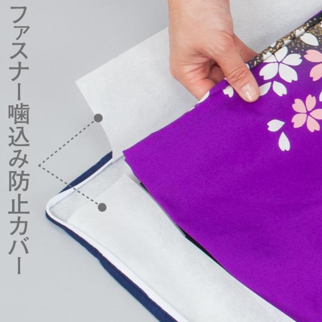 ●ダブルジップファスナーでL字に開く。ファスナー開閉時に着物を巻き込んで傷つけてしまうのを防ぐ布付き。
