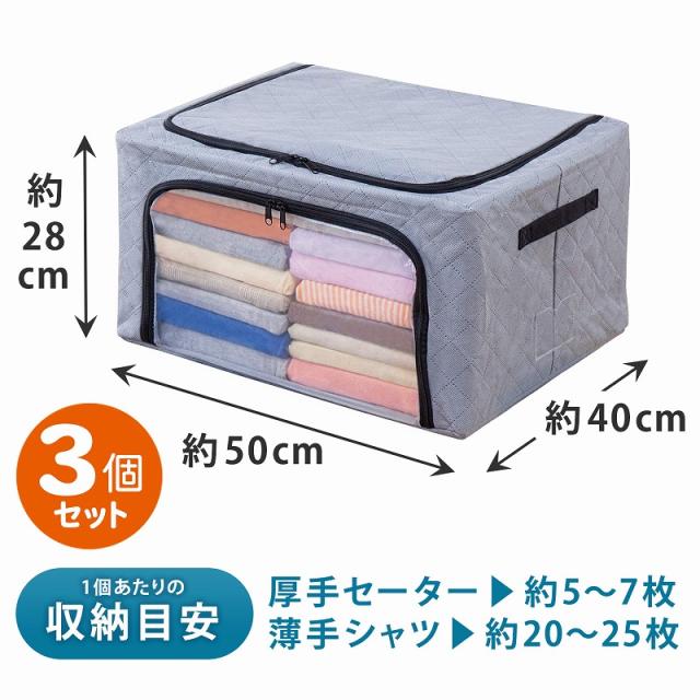商品名:積み重ねて前からも出せる活性炭収納ケース 3個組サイズ:約幅50×奥行40×高さ28cmポリプロピレン、活性炭シート、鉄、ポリエチレン耐荷重:50kgセット内容:3個セット【特長】●ワイヤーでしっかり自立。積み重ね出来る。●上からも前からも出し入れ出来て便利。●活性炭の力で消臭。●通気性の良い不織布製で空気を自然に入替●汚れやホコリから大切な収納物を守ります●中身が見える透明窓付き【ご注意】●中のワイヤーをしっかり立ててご使用ください。