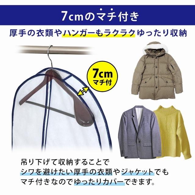 ●しわをつけたくない大切な衣類を、吊り下げたままホコリなどの汚れから守ることができる衣類カバー。マチ付きで厚手の衣類や型崩れしにくい厚手のハンガーでも使用できる。