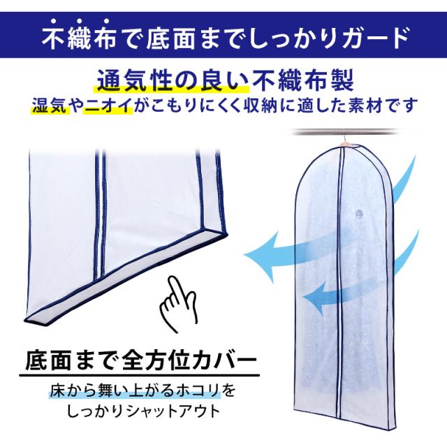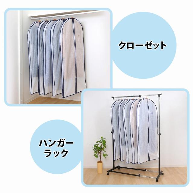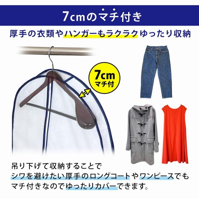 ●しわをつけたくない大切な衣類を、吊り下げたままホコリなどの汚れから守ることができる衣類カバー。マチ付きで厚手の衣類や型崩れしにくい厚手のハンガーでも使用できる。