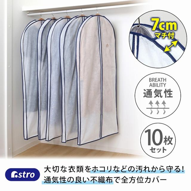 衣類カバー マチ付きで厚手衣類対応 ロング丈 10枚組 吊り下げたまま使えるゆったりシワになりにくいマチ付き洋服カバー アストロ 110-74