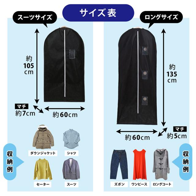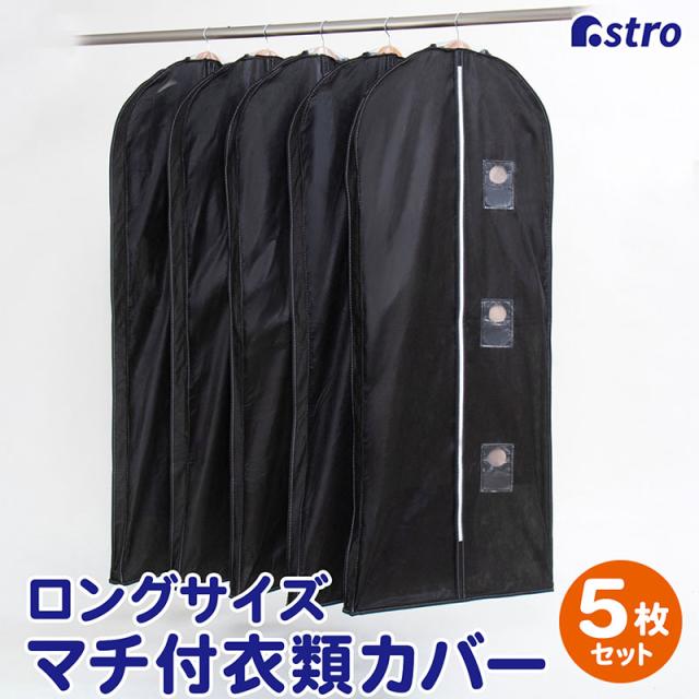 商品名:マチ付 黒 ロングカバー 5枚組カラー:ブラックサイズ:約幅60×長さ135cm×マチ5cm材質:ポリプロピレン・ポリエチレン内容:5枚生産国:中国【特長】●通気性の良い不織布で衣類を湿気やホコリから守り大切に保管。●底部も縫製されているので、全方位からのホコリをシャットアウト。●3か所の市販の防虫剤を入れられるポケット、中の衣類が見える小窓が便利。●マチ付のロングサイズなので厚手の洋服やコート、ワンピースなどの収納にオススメ。【ご注意】●洗濯はできません。【不織布とは】不織布(ふしょくふ)とは、繊維を糸にして織ったり編んだりせずに、そのままシート状にした「織らない布」のことです。通気性が良くホコリを通しにくい生地のため、衣類や寝具の収納に適しています。アストロではスパンボンド方式で製造されたポリプロピレン製の不織布を主に使用しています。ASTRO CO., LTD established in 1970