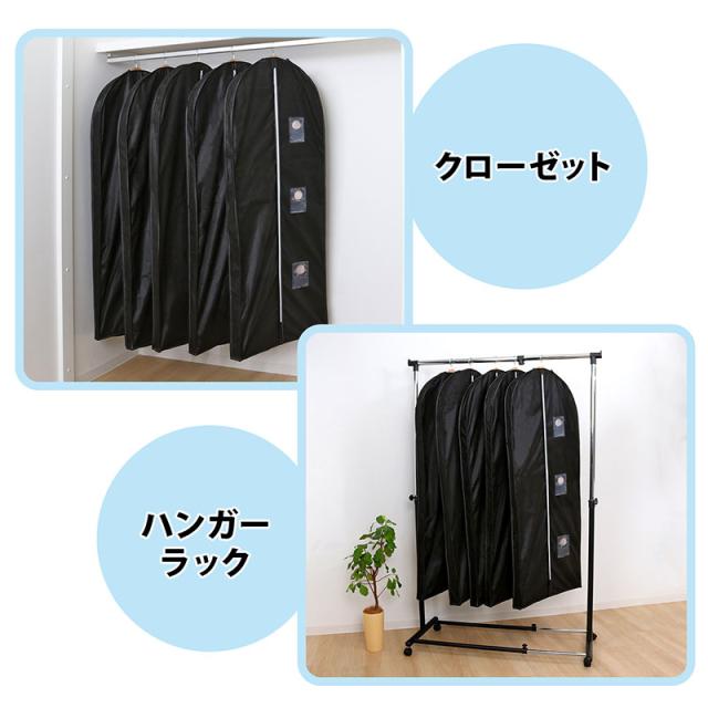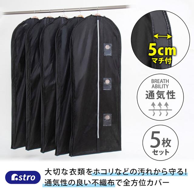 洋服カバー 不織布 5枚組 マチ付 厚手 黒 スーツサイズ 型崩れ防止 衣類カバー 衣装カバー ほこり除け 通気性良好 アストロ 110-76