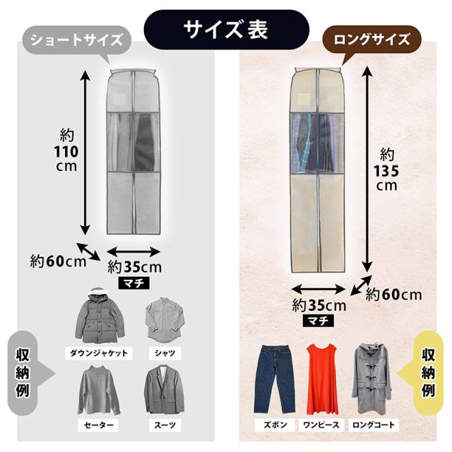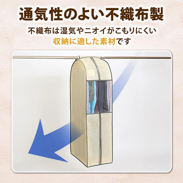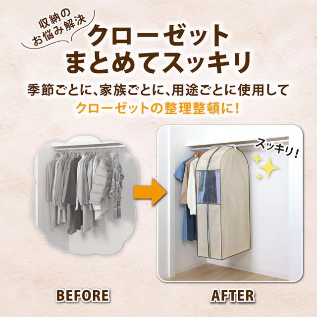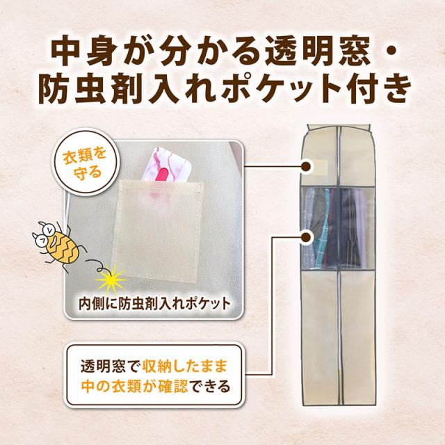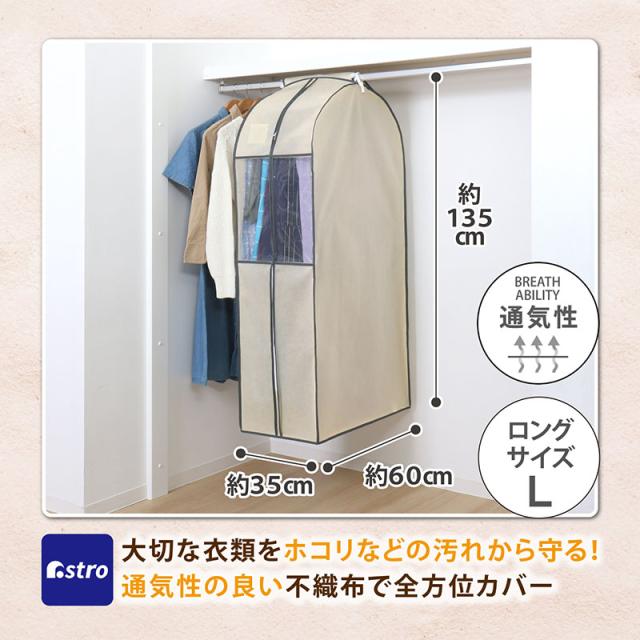衣類カバー まとめて収納 不織布製 ロングサイズ ベージュ 防虫ポケット付 窓付 クローゼット 吊り下げ 通気性良好 アストロ 131-24