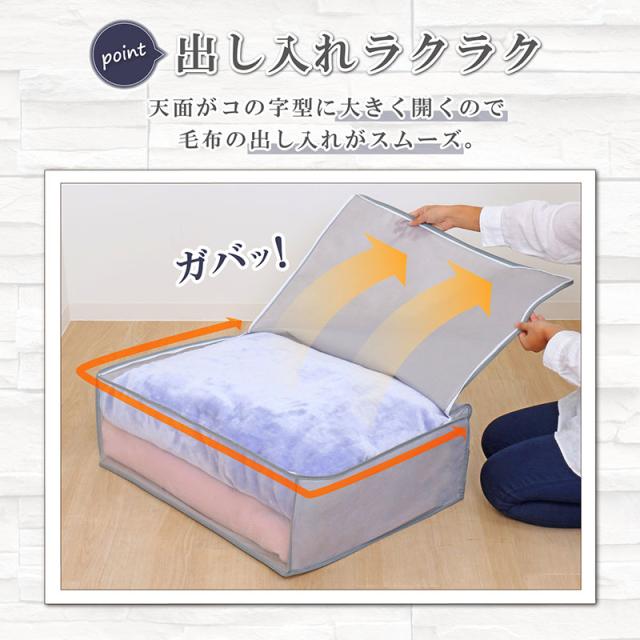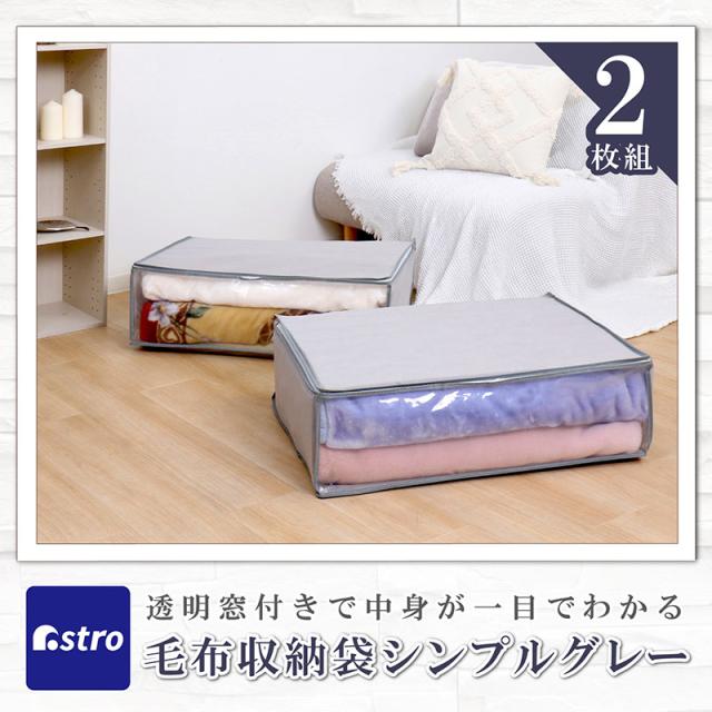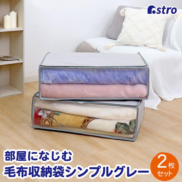商品名:毛布保存袋2枚組 シンプルグレーカラー:グレーサイズ:約幅70×奥行53×高さ23cm材質:本体/ポリプロピレン、透明窓/ポリエチレン内容:2枚生産国:中国【収納目安(袋1枚あたり)】●厚手毛布:約2枚●薄手毛布:約3〜4枚【特長】●通気性の良い不織布で毛布を湿気やホコリから守り大切に保管。●透明窓付きでファスナーを開けずに中身が一目で分かる。●3方ファスナーで収納物の出し入れがカンタン。●落ち着いたグレーカラーで収納スペースがスッキリ。【ご注意】●洗濯はできません。【不織布とは】不織布(ふしょくふ)とは、繊維を糸にして織ったり編んだりせずに、そのままシート状にした「織らない布」のことです。通気性が良くホコリを通しにくい生地のため、衣類や寝具の収納に適しています。アストロではスパンボンド方式で製造されたポリプロピレン製の不織布を主に使用しています。ASTRO CO., LTD established in 1970