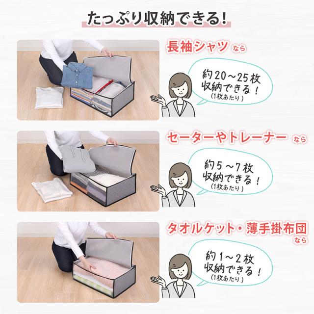 収納目安:セーターやトレーナー約5〜7枚、長袖シャツ約20〜25枚、タオルケット約1〜2枚、ブランケット約2〜4枚
