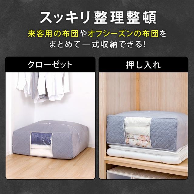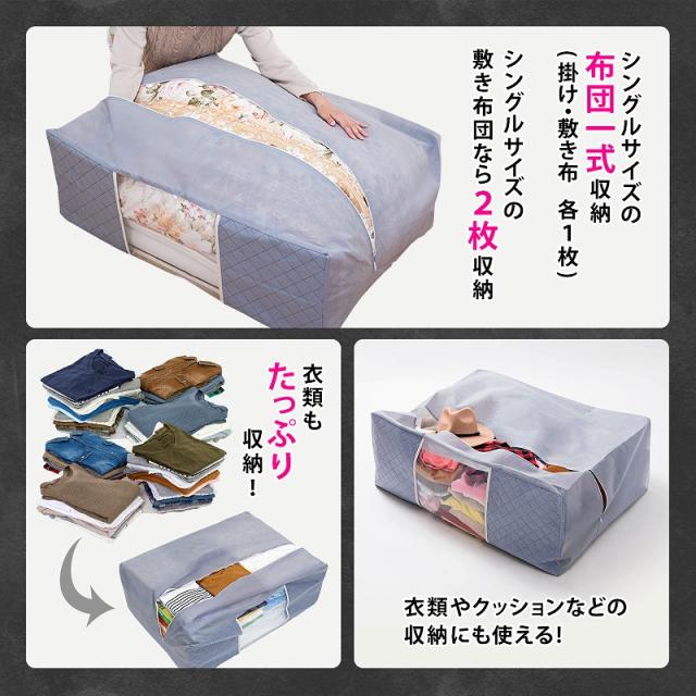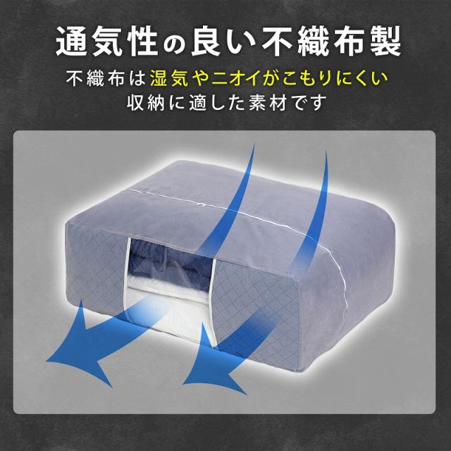 商品名:炭入り 布団保存袋カラー:グレーサイズ:約幅96×奥行70×高さ35cm(収納目安:ふとん 約2枚(掛け・敷き布団 各1枚))材質:表裏面:ポリプロピレン、中材:活性炭シート、透明窓:ポリエチレン内容:1枚生産国:中国【収納目安】●布団約2枚 (掛け・敷き布団 各1枚)【特長】●通気性の良い不織布製。オフシーズンや来客用の布団を湿気やホコリから守り大切に保管。●活性炭シート入りの3層構造生地で、ニオイの元となる物質を吸着し除去。消臭しながら収納。●透明窓付きで中身が一目でわかる。大きく開くファスナーで出し入れもラクラク。●かさばる布団をすっきり収納できる。押し入れやクローゼットの整理整頓に便利。【ご注意】●洗濯はできません。●消臭効果は開封後約1年です。【不織布とは】不織布(ふしょくふ)とは、繊維を糸にして織ったり編んだりせずに、そのままシート状にした「織らない布」のことです。通気性が良くホコリを通しにくい生地のため、衣類や寝具の収納に適しています。