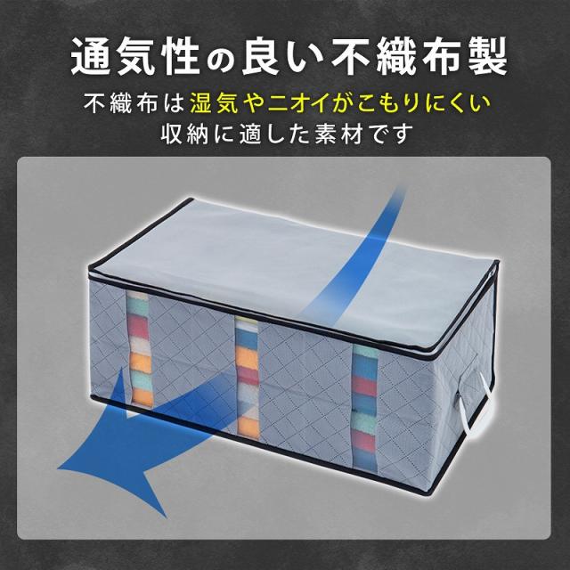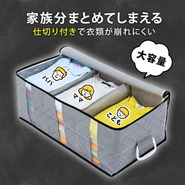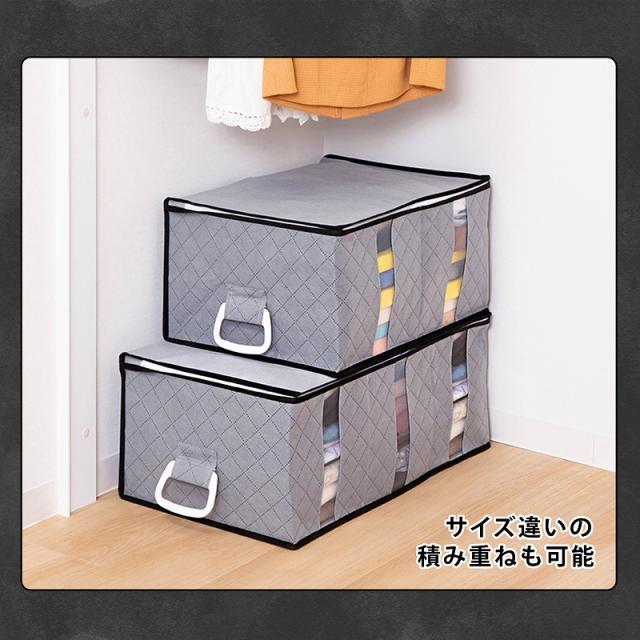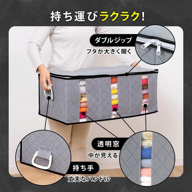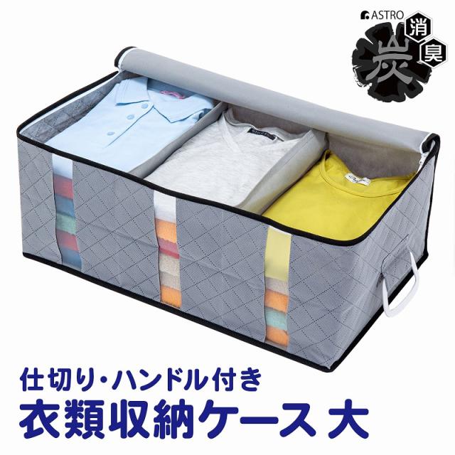 商品名:活性炭ハンドル付衣類収納ケース(大)カラー:グレーサイズ:約幅60×奥行35×高さ25cm材質:ポリプロピレン、ポリエチレン、活性炭シート内容:1個生産国:中国【特長】●通気性の良い不織布で衣類や、タオルなどを湿気やホコリから守り大切に保管。●活性炭の力でニオイの元となる物質を吸着し除去。気になるニオイを抑える。●仕切り入りでスペースが3つあるので、家族の洋服をそれぞれ分けて収納できて便利。●透明窓から中身が分かり、3方向に開くファスナーで収納物の出し入れラクラク。●両サイドのハンドルで、クローゼットや押入れからの出し入れ、移動もラクラク。【ご注意】●洗濯はできません。【不織布とは】不織布(ふしょくふ)とは、繊維を糸にして織ったり編んだりせずに、そのままシート状にした「織らない布」のことです。通気性が良くホコリを通しにくい生地のため、衣類や寝具の収納に適しています。アストロではスパンボンド方式で製造されたポリプロピレン製の不織布を主に使用しています。ASTRO CO., LTD established in 1970