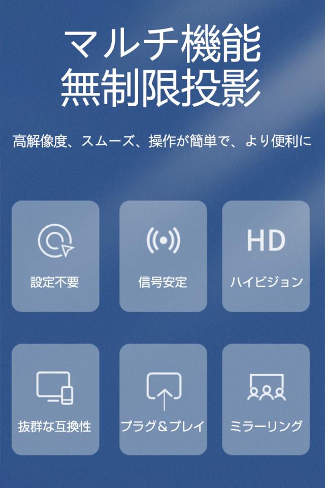 本製品は、マルチプラットフォームとシステムのミラーリングに対応します。iPhone /iPad、Androidのスマートフォン/タブレット、Windowsコンピューター、Macノートパソコンの利用をすべてサポートします。ユーザーは随時リリースされるファームウェアをオンラインで無料ダウンロードでき、さまざまなプラットフォームの最新のオペレーティングシステムと互換性があり、ミラーリングをより安定させ、よりエキサイティングなハッピーミラーリングを体験できます!