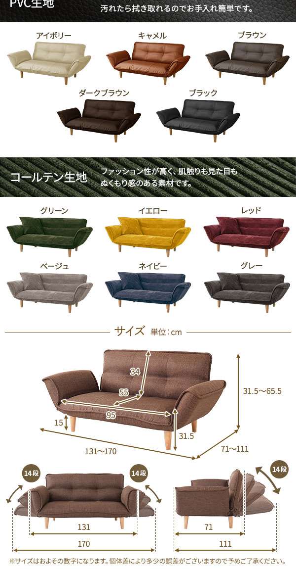 ・通常131cmとコンパクトな横幅なのに肘掛けを倒すことで最大170cmまで広がります。