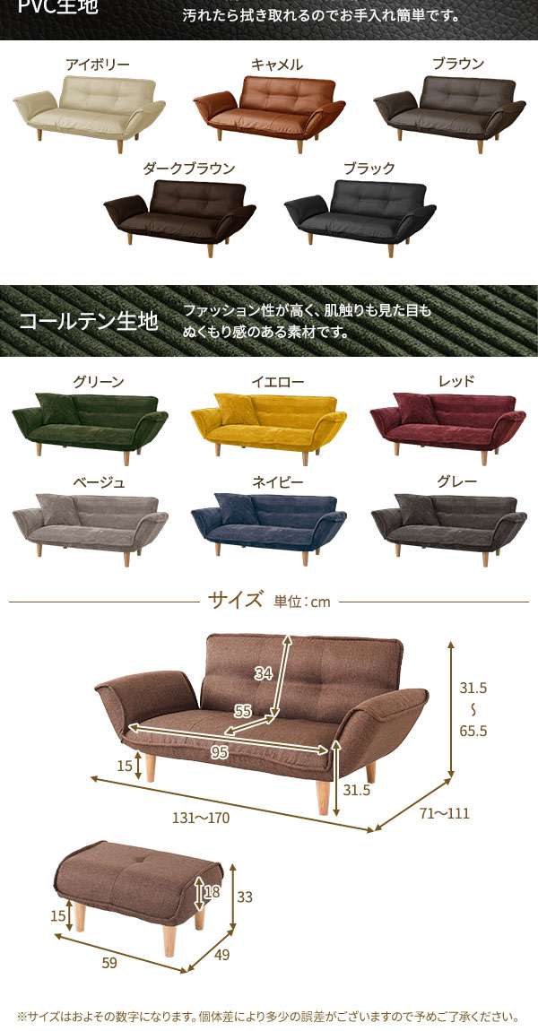 ・通常131cmとコンパクトな横幅なのに肘掛けを倒すことで最大170cmまで広がります。