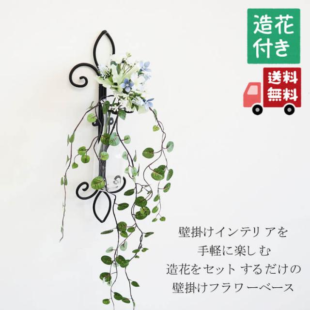 白と淡いブルーの造花が可愛らしく、蔓系のワイヤープランツがとても似合います。壁掛け一輪挿しなので長めに下に垂れ下がる感じがとてもおしゃれです。