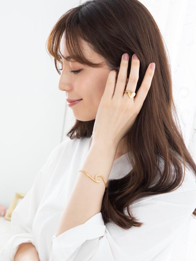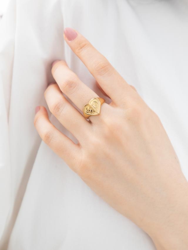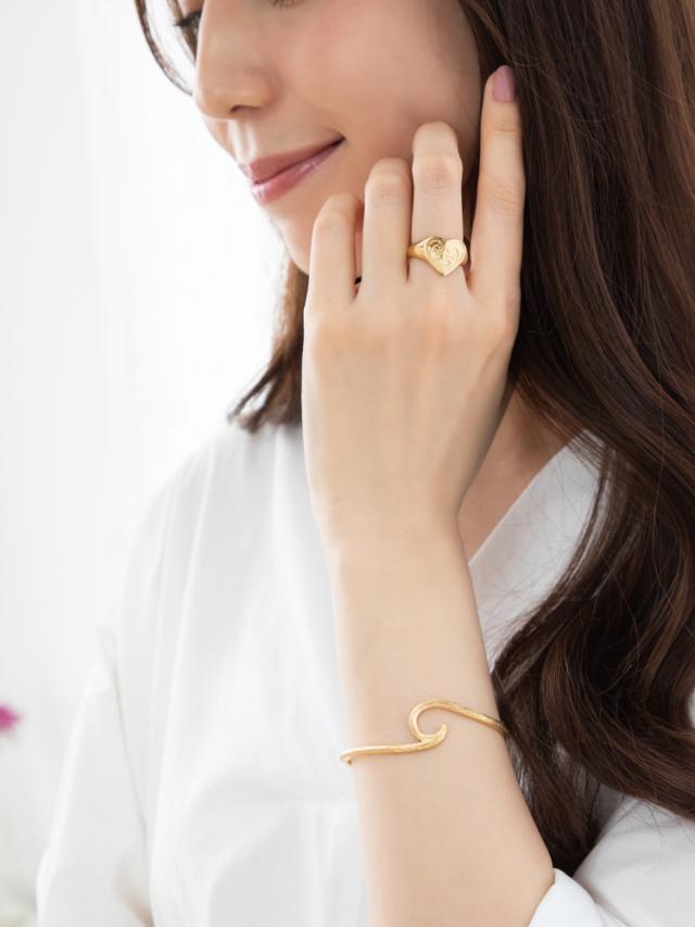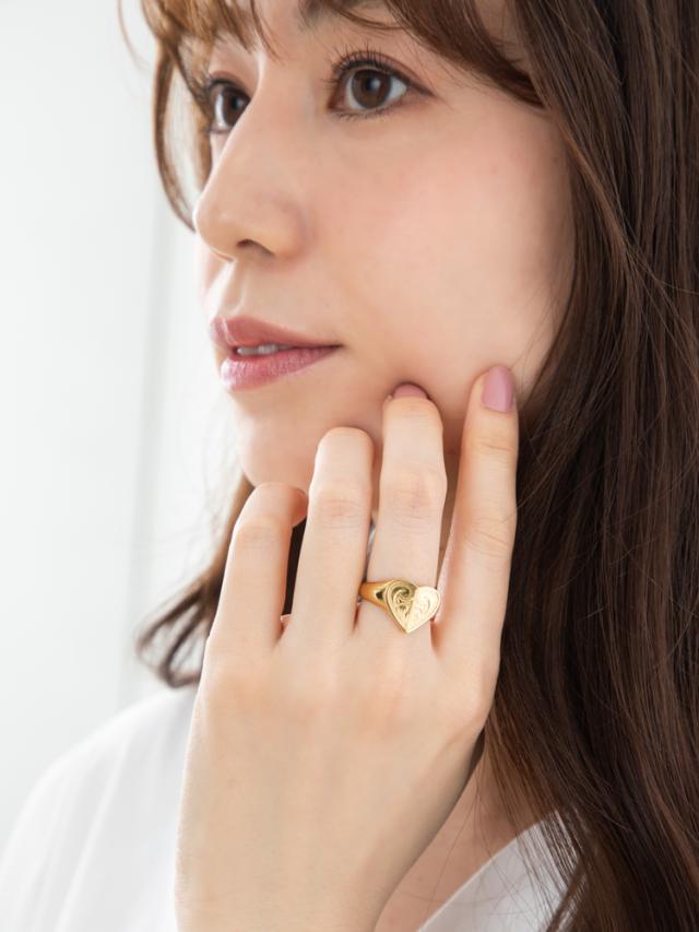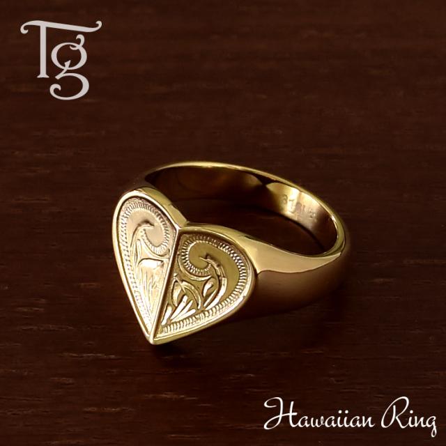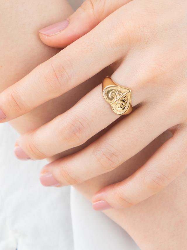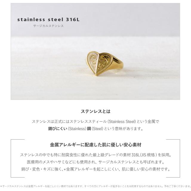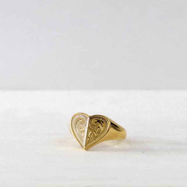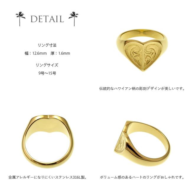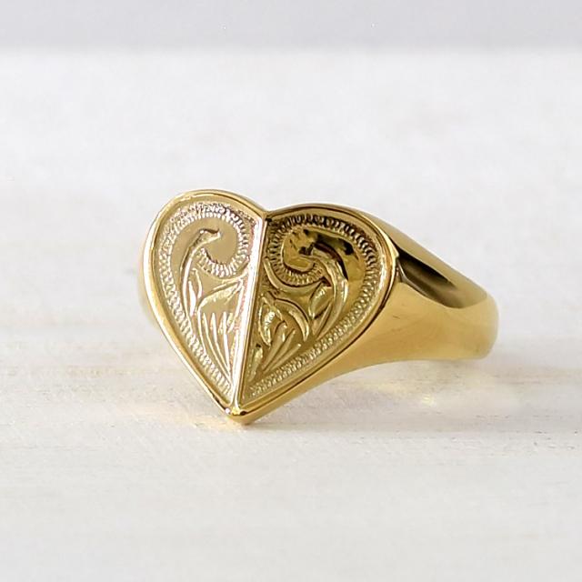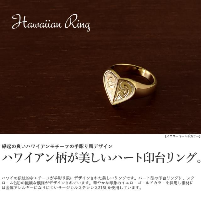 ハワイの伝統的なモチーフが手彫り風にデザインされた美しいリングです。ハート型の印台リングに、スクロール(波)の繊細な模様がデザインされています。華やかな印象のイエローゴールドカラーを採用し素材には金属アレルギーになりにくいサージカルステンレス316Lを使用しています。誕生日、記念日、クリスマス、ホワイトデー、母の日など特別なギフトにおすすめです。