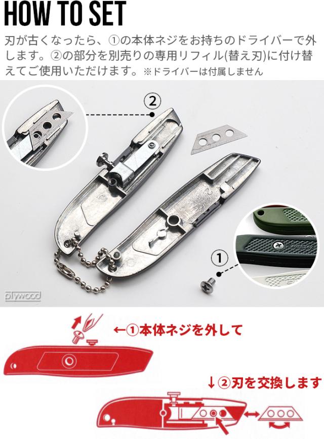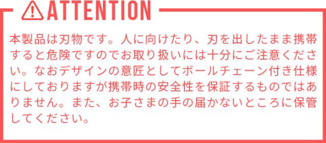 | 本製品は刃物です。人に向けたり、刃を出したまま携帯すると危険ですのでお取り扱いには十分にご注意ください。なおデザインの意匠としてボールチェーン付き仕様にしておりますが携帯時の安全性を保証するものではありません。また、お子さまの手の届かないところに保管してください。 |