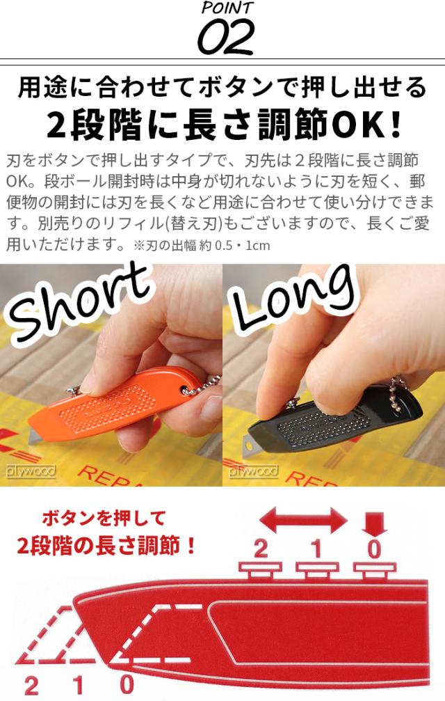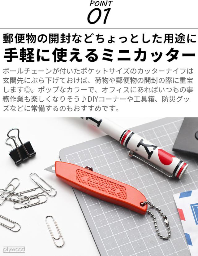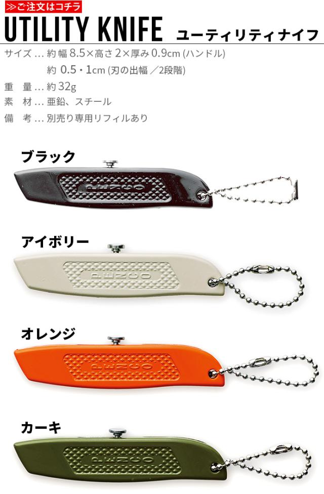ボールチェーンが付いたポケットサイズのカッターナイフ「Utility Knife/ユーティリティナイフ」のご紹介です。ボタンで刃を押し出すタイプのカッター。刃先は2段階に長さ調節できるので、段ボールを開封するとき刃が長過ぎると中まで切れそうで心配!なんてシーンでも安心してお使いいただけます♪玄関先にぶら下げておけば、届いた荷物もすぐに開封できてストレスフリー。刃が古くなったら本体のネジを外して別売りの刃(リフィル)へ付け替えも可能◎。DIYコーナーや工具箱、防災グッズに常備しておいても重宝しそうです!