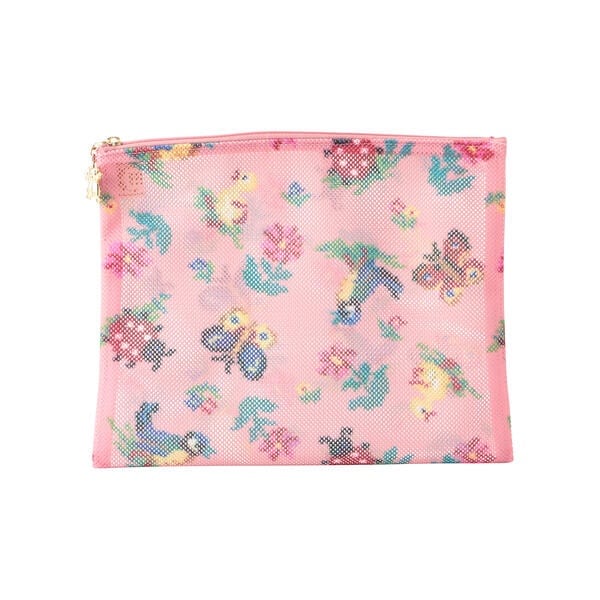 お花のまわりをちょうちょやアヒルが駆けめぐる、愛らしい「ハイジ」シリーズのアイテム。メッシュ素材の軽やかなフラットポーチでたっぷり容量があり使い勝手も良く、トラベルやスポーツジム通いでは、着替えを入れてお使いいただくのもおすすめです。ファスナートップにあしらった、クマ型のチャームもかわいいポイント。