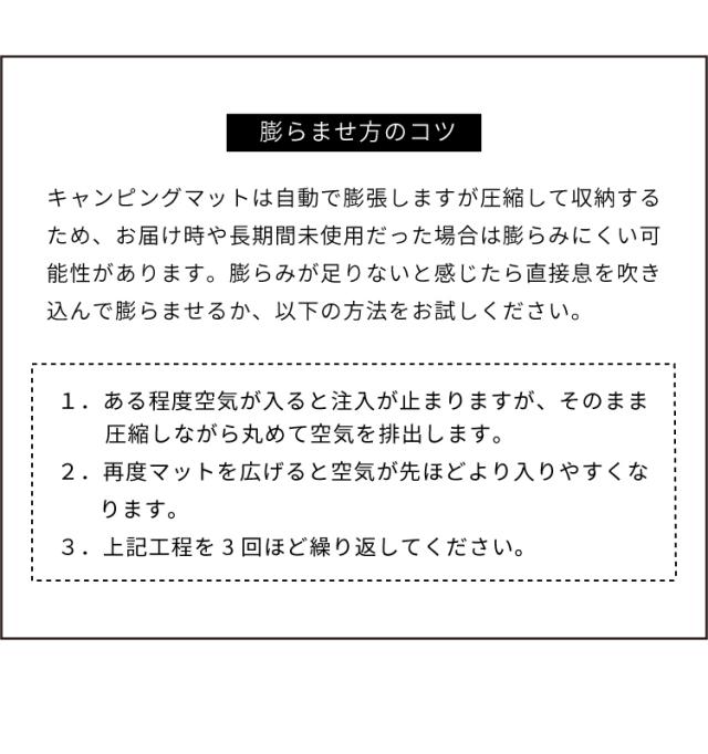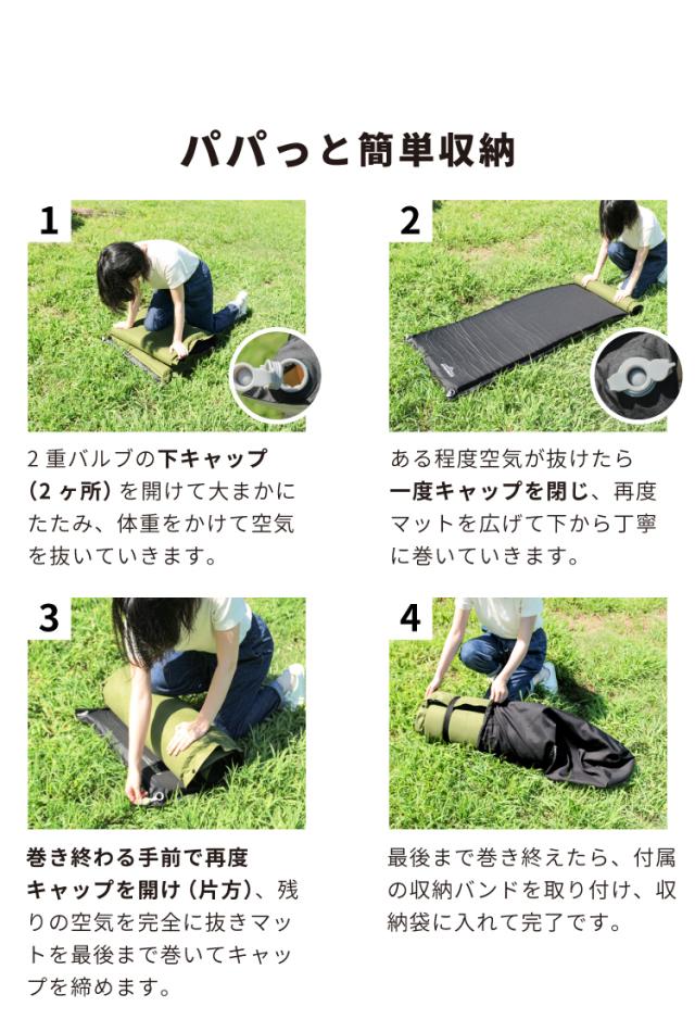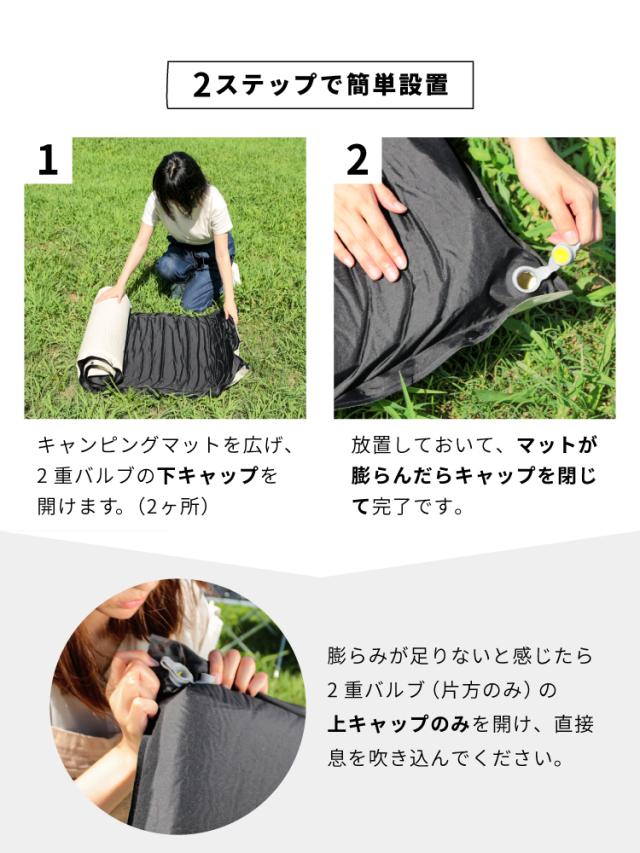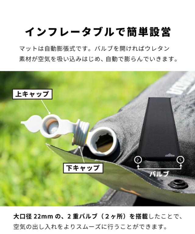 自動膨張式(インフレータブル):マット下部のバルブを開くことでマットが自動的に膨らみます。