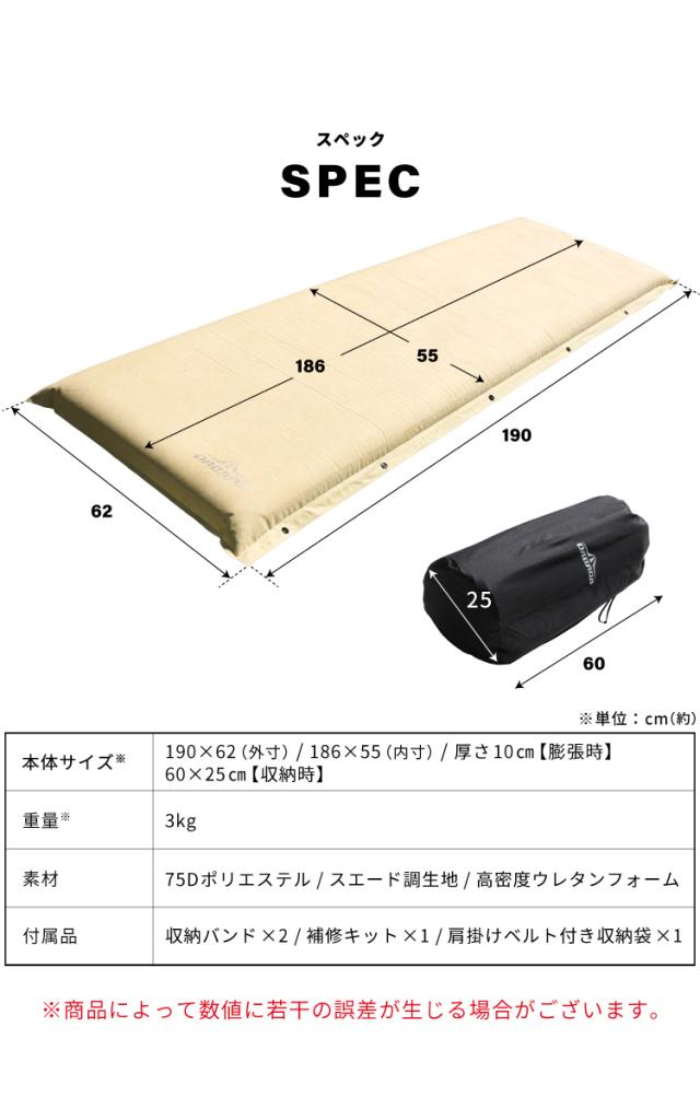 190×62cm(外寸)/186×55cm(内寸)/厚さ10cm(膨張時)