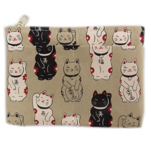 ポーチ 和柄 前ポケット付き お化粧 コスメ メイク 小物入れ 福あつめ招き猫ベージュ 日本製 女性用 レディース メンズ 男性用