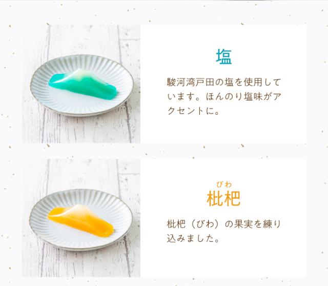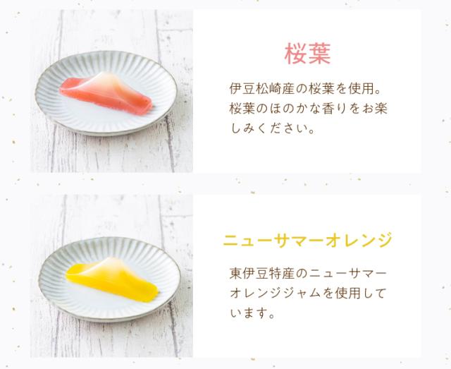 原材料:砂糖(国内製造)、白餡(国内製造)、還元水飴、赤餡、水飴、寒天、ビワ果実、柚皮、ニューサマーオレンジ果皮、桜葉、塩/酸味料(クエン酸)、香料、着色料(黄4、赤3、青1)