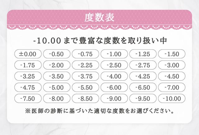 【度数(PWR)】±0.00D/-0.50D〜-5.00D(0.25Dステップ)/-5.00D〜-10.00D(0.50Dステップ)