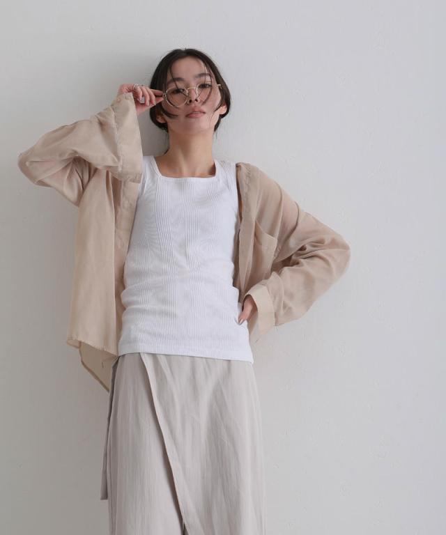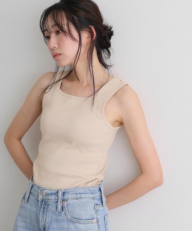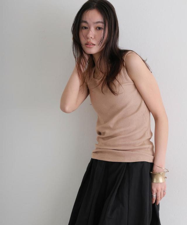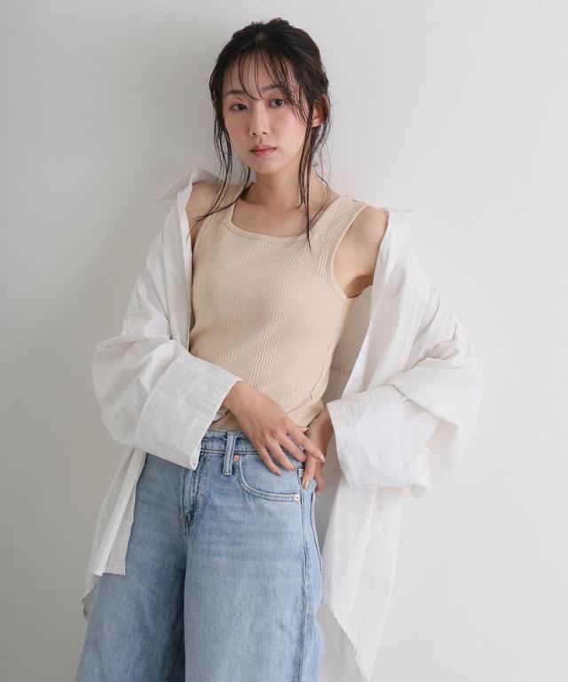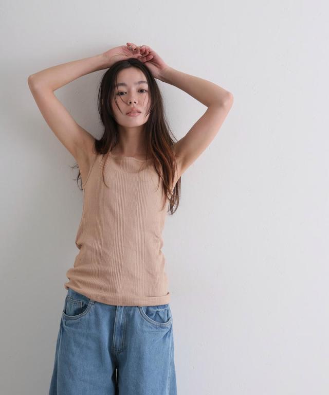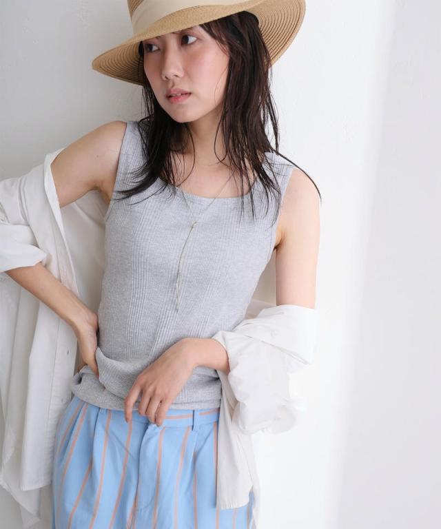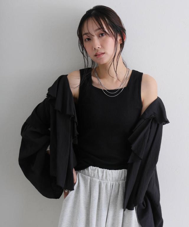 ★シアーシャツやカーディガンとのコーデに重宝するタンクトップ。