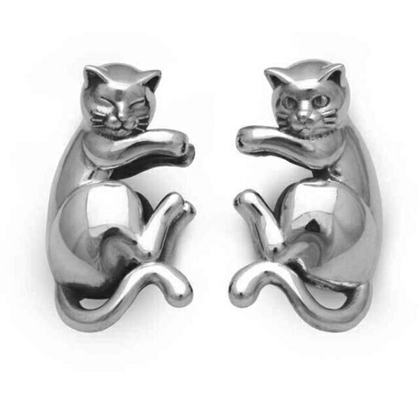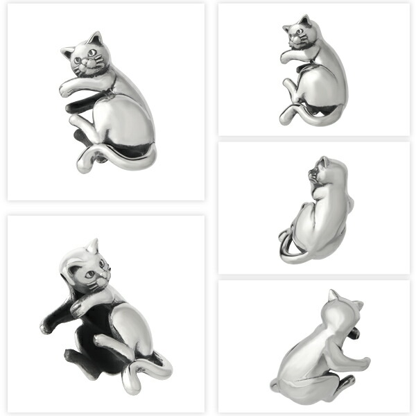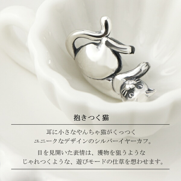 耳に小さなやんちゃ猫がくっつくユニークなデザインのシルバーイヤーカフ。