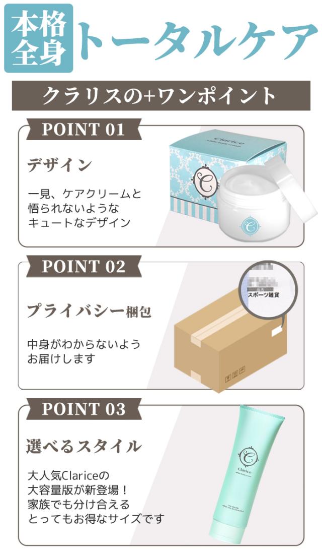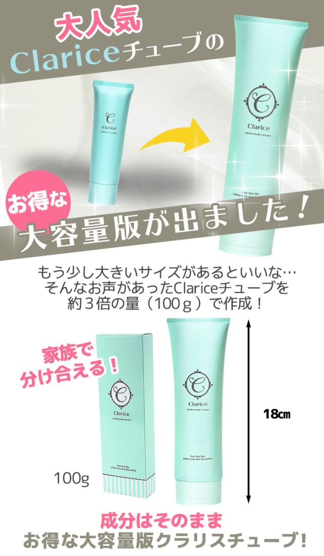 | 大人気Clariceのお得な大容量版が出ました! | もう少し大きいサイズがあるといいな。そんなお声から、お得な大容量版サイズを作りました!100gあり、家族みんなでご使用できます♪ |
