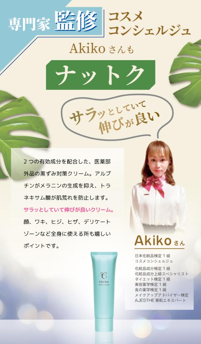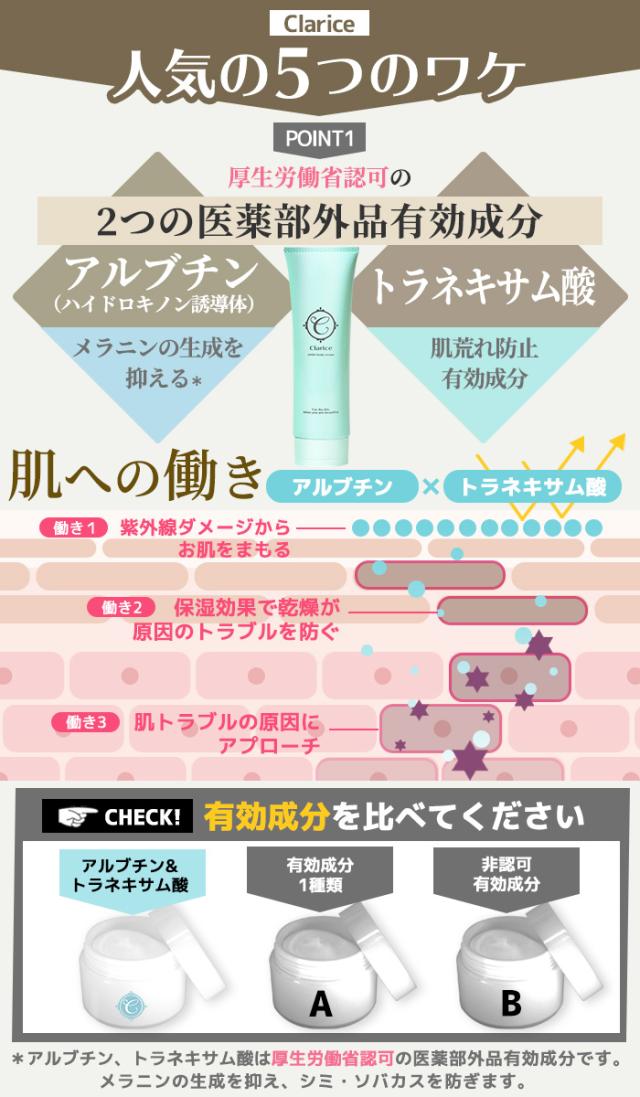 | クラリスは医薬部外品です | 有効成分トラネキサム酸、アルブチン <効能、効果> 肌あれ。あれ性。 油性肌。 メラニンの生成を抑え、しみ、そば かすを防ぐ。 肌をひきしめる。肌を清浄にする。肌を整える。 皮膚をすこやか に保つ。皮膚にうるおいを与える。 皮膚を保護する。皮膚の乾燥を防ぐ。 |