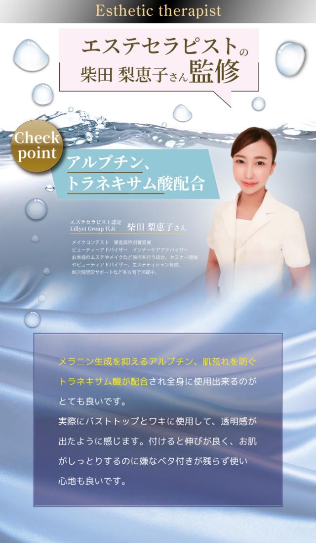有効成分:トラネキサム酸、アルブチン その他の成分:BG、濃グリセリン、カルボキシビニルポリマー 、水酸化Na、スクレロチウムガム、フェノキシエタノール、スク ワラン、メドウフォーム油、トリエチルヘキサン酸グリセリル、セ テアリルアルコール、ベヘニルアルコール、ラウロイルグルタミン 酸ジ(コレステリル・ベヘニル・オクチルドデシル)、ジメチコン、 セスキオレイン酸ソルビタン、SEステアリン酸グリセリル、ステ アリン酸POE(20)ソルビタン、水添大豆リン脂質、天然ビタミ ンE、グリセリンエチルヘキシルエーテル、グリセリン脂肪酸エス テル、ピロ亜硫酸Na、1,2ーペンタンジオール、アロエエキス ー2、酵母多糖体末、グリセリルーN−(2−メタクリロイルオキ シエチル)カルバメート・メタクリル酸ステアリル共重合体、チン ピエキス、ウメ果実エキス、シルバーバイン果実エキス