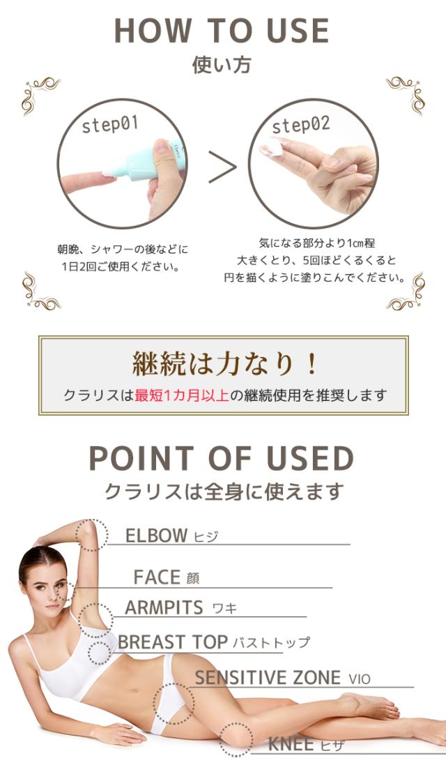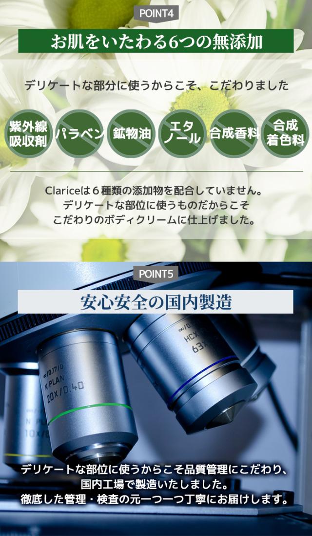 | お肌をいたわる6つの無添加! | クラリスは6つの無添加!お肌に優しい成分だからこそ、デリケートゾーンに安心してご使用いただけます。さらに、クラリスはデリケートゾーンだけではなく、全身にお使いいただけます! |