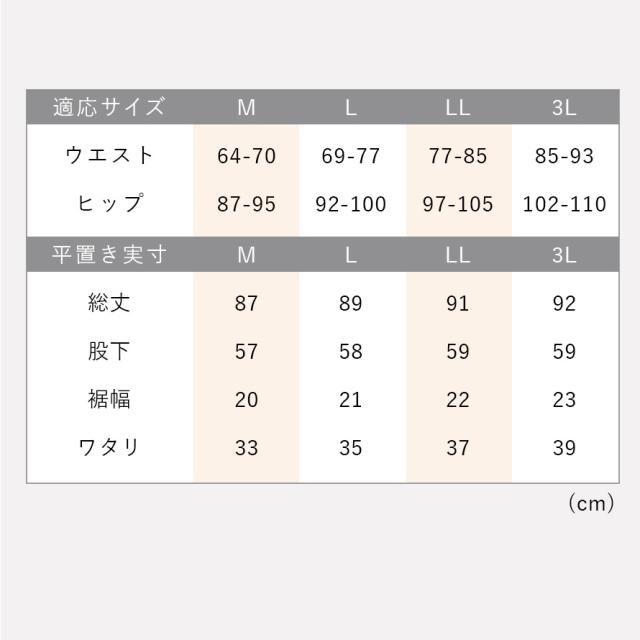 ■サイズ:M/ウエスト64-70、ヒップ87-95、総丈87、股下57、裾幅20、わたり幅33、L/ウエスト69-77、ヒップ92-100、総丈89、股下58、裾幅21、わたり幅35、LL/ウエスト77-85、ヒップ97-105、総丈91、股下59、裾幅22、わたり幅37、3L/ウエスト85-93、ヒップ102-110、総丈92、股下59、裾幅23、わたり幅39cm