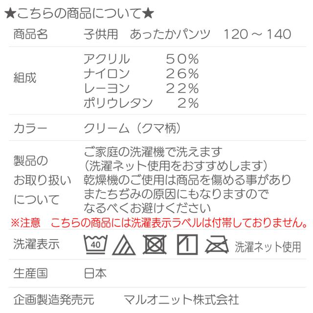 子供用 あったかパンツ クマ柄 サイズ:120〜140 日本製 トドラー キッズ 秋 冬用