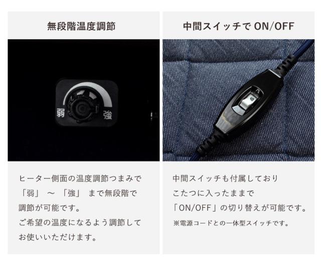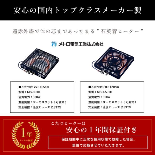 | ■ ヴィンテージテイストのこたつ台です。一人暮らしにもおすすめのコンパクトサイズで、オールシーズンご使用いただけます。 ■ こたつヒーターは安心のメーカー1年保証です。 ■ 安心のメトロ製ヒーターです。 ■ 中間電源スイッチ等、あると便利な機能付き。無段階温度調節が可能で、ご希望の温度になるように調節してご使用ください。 ※2025年9月より仕様が変更となっております。 ※ こたつ掛け布団、敷き布団は別売りです。 ※ 付属の取り扱い説明書を必ずお読みの上ご使用ください。 ※ こちらの電化製品につきまして、商品の特性上ご注文後の返品・交換はお受け致しかねます。あらかじめご了承ください。 ※ この製品は海外ではご使用になれません。変圧器をご使用いただいた場合でもご使用になれません。 ※ 掲載写真は表記サイズと異なる場合がございます。 ※ 画面上のカラーはご使用ブラウザやモニターの設定により、実物とは若干異なる場合がございます。あらかじめご了承の上、ご注文をお願いいたします。 |