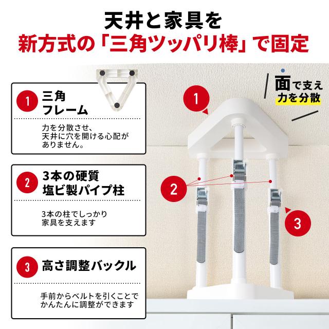 ●家具の揺れや転倒を防ぐ面固定式耐震突っ張り棒です。●天井と家具を三角フレームが力を分散させ、天井に穴を開ける心配がありません。